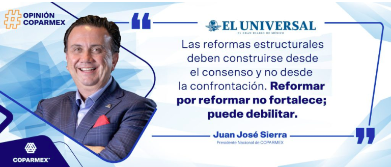 Artículo de Opinión escrito por Juan José Sierra Álvarez , Presidente Nacional de COPARMEX | Vía: @El_Universal_Mx X:@jsierraalvarez Las reformas estructurales deben construirse desde el consenso y no desde la confrontación. Reformar por reformar no fortalece; puede debilitar. […]