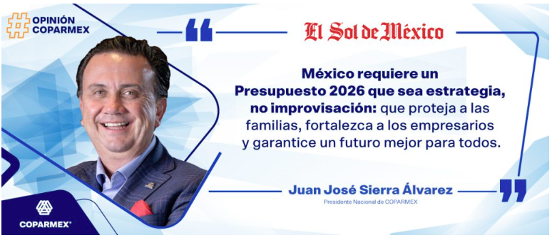 Artículo de Opinión escrito por Juan José Sierra Álvarez , Presidente Nacional de COPARMEX | Vía: @elsolde_mexico X:@jsierraalvarez El Presupuesto de Egresos 2026 define en los hechos el proyecto de país que nos proponemos. Frente a la […]