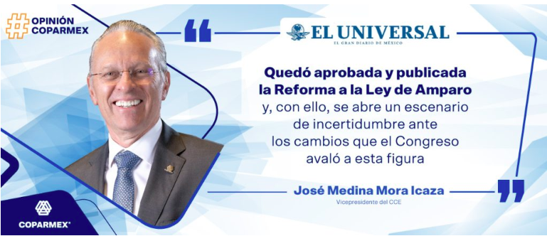 Artículo de Opinión escrito por José Medina Mora, Vicepresidente de CCE de COPARMEX | Vía: @El_Universal_Mx X:@JoseMedinaMora Quedó aprobada y publicada la Reforma a la Ley de Amparo en el país y, con ello, se abre un […]
